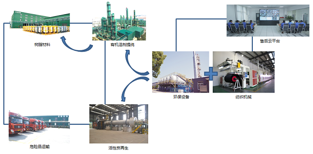 活性炭再生项目是巨联加强循环产业链关键环节建设的重要组成部分,是产业链的又一次延伸。14年来,巨联从有机废气治理设备的研发制造起步,不断向相关环保产业迈进,逐渐构建起“装备制造-有机废气治理-废弃物资源化利用”的全过程治理模式,形成了以环保设备和纺织机械为主,以有机溶剂、树脂材料、活性炭、危废处置、危险品运输为辅的业务板块。