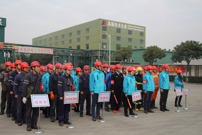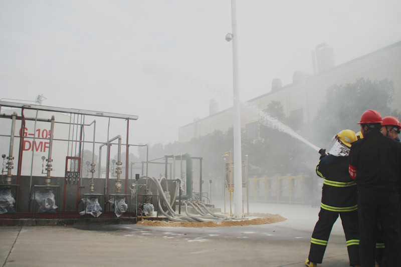 上午9时,演练正式开始。9时01分,树脂车间操作人员在巡检时发现罐区g-105储罐有大量dmf泄漏,随即关闭阀门。但因未使用防爆扳手,敲击产生的电火花点燃dmf,进而造成起火,现场其他人员立即向部门主管反映。在确认事故后,部门主管立即启动部门级应急预案,并向安环中心汇报险情。安环中心接警后,成立应急指挥部,同时迅速将险情信息汇报给各级领导。9时04分,总指挥要求立即召集紧急应变小组,实施现场救援,并即刻疏散无关人员。9时05分,应变小组成员到达事故现场,迅速开展抢险工作,并请求外部力量支援。9时07分,全部人员疏散完毕。9时15分,明火被扑灭,泄漏源堵漏成功,险情解除。至此,消防演练圆满结束。