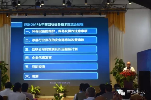 9月5日下午,我公司“dmf&甲苯回收设备技术交流会”在盛泽绸都印象主题酒店顺利召开。本次会议主要面向涂层行业从业者,内容涵盖回收设备的维护保养、涂层生产的安全事项、公司未来的发展计划等多个方面。通过会议,我们期望能够将“尚安全、重维护”的理念在行业内进一步普及,同时也向与会企业表达了巨联与客户“同舟共济、携手未来”的决心与愿望。来自涂层及相关生产设备制造的200余位企业负责人和技术骨干出席了交流会。
